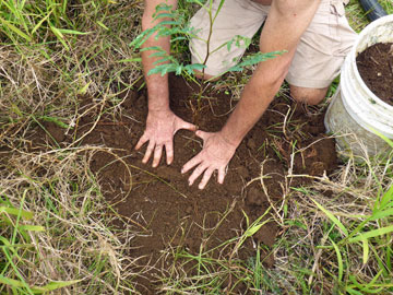 Here we are covering the area around the koa tree with mulch, in this case some Hawaiian fern debris. Mulch does two things. First it helps prevent grass and other plants from "encroaching" on the young koa tree. Second, it provides nutrients to the seedling as the mulch deteriorates.